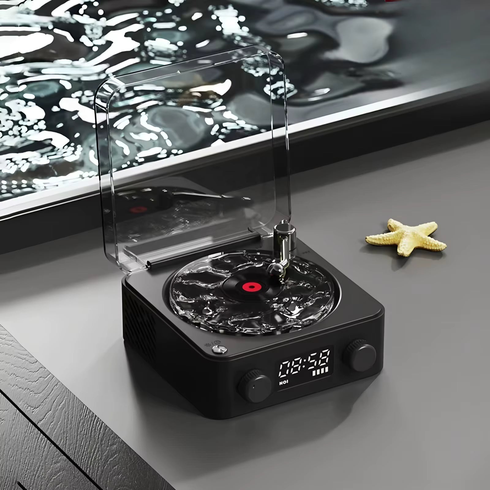 The transparent ripple-style disc rotates with the music, creating a stunning breathing light effect that elevates any room. Designed with a soft, non-dazzling display that won’t disturb at night — and can be reactivated with a gentle tap or vibration.